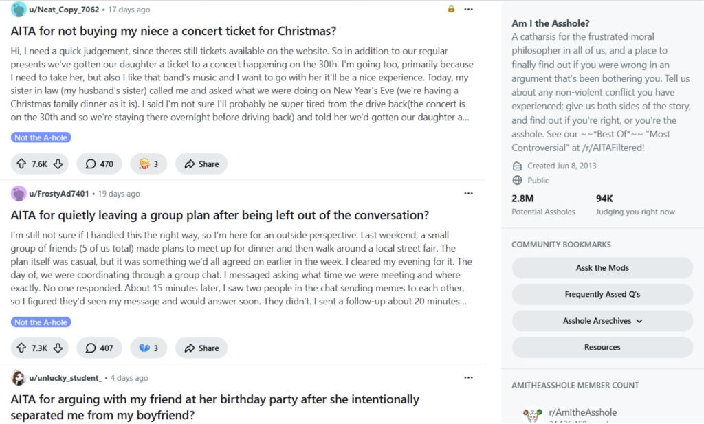 AITA is formatted around social dilemmas. The original poster shares a narrative describing a personal conflict they cannot get closure on – whether that is with family, friends, or colleagues – and asks strangers to judge whether they acted appropriately. Commenters will then typically respond with standard verdicts: